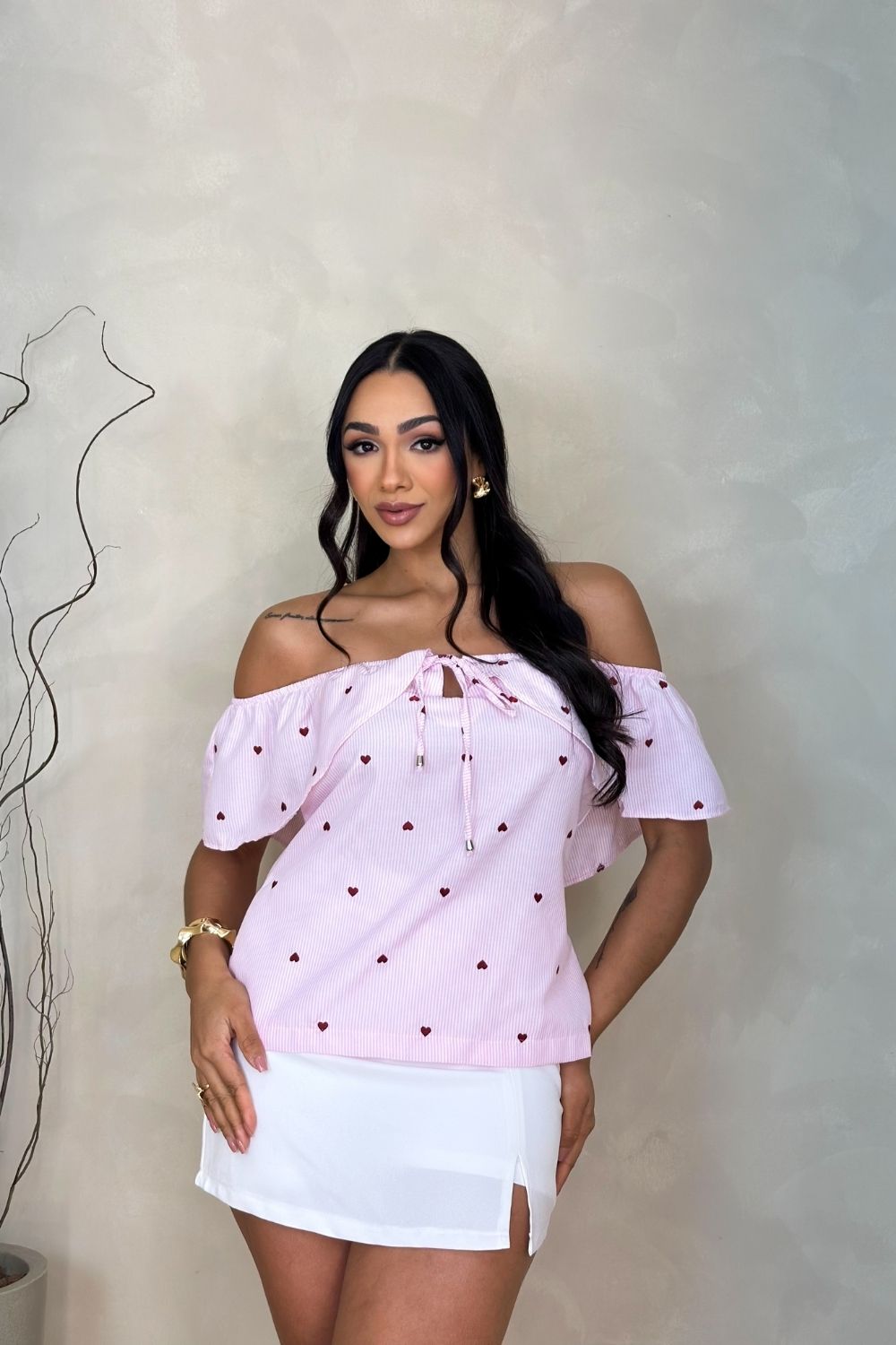 Delicada e cheia de charme, a blusa ciganinha é a escolha perfeita para looks femininos e modernos. Confeccionada em tecido de camisaria leve, proporciona conforto e ótimo caimento. Possui elástico nos ombros, criando o clássico efeito ombro a ombro, e detalhe de amarração frontal, que adiciona um toque de estilo e romantismo. As listras e o bordado de corações traz um ar divertido e apaixonante à peça, ideal para compor produções casuais com um toque especial.