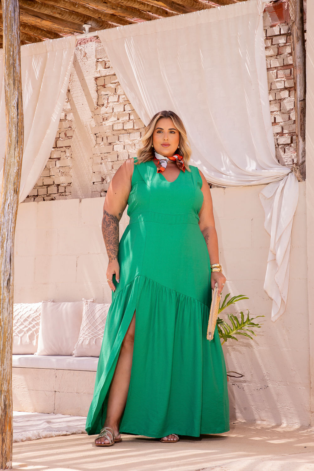 Vestido Longo Aruba Recorte Manga de Lapela VERDE